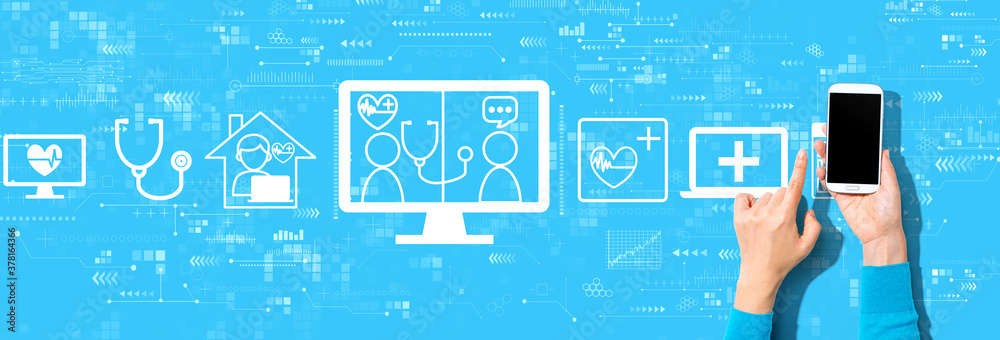 Telehealth theme with person using a smartphone on a blue ba Wallpaper