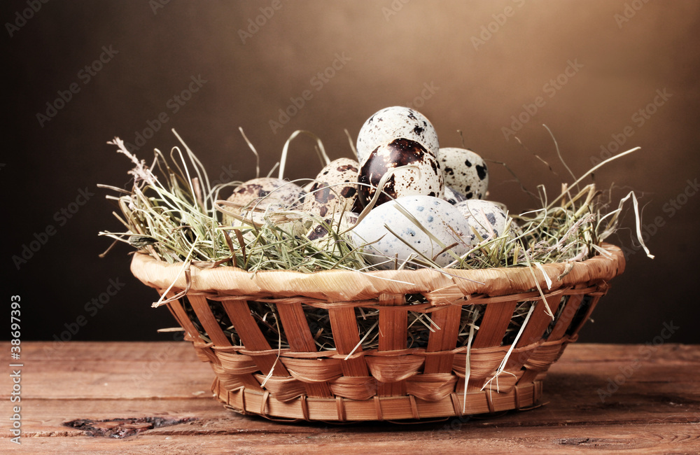 Quail eggs in nest on wooden table on brown background Wallpaper