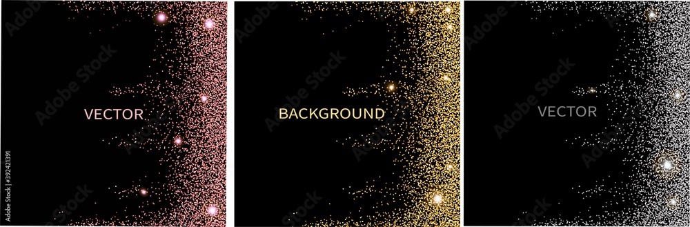 Set of vector abstract backgrounds with falling sparkle rose gold glitter and stars.