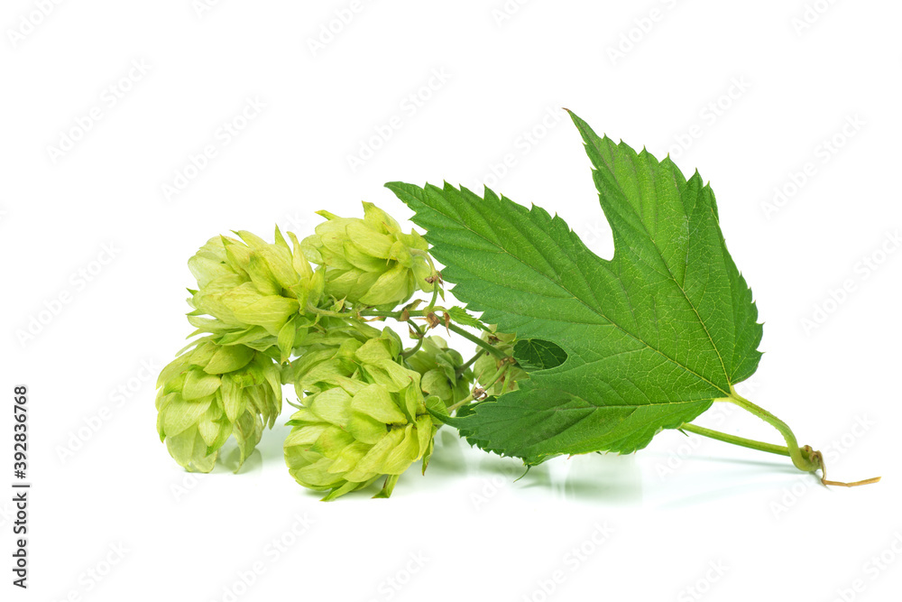 Hop branches with cones and green leaves isolated on a white Wallpaper