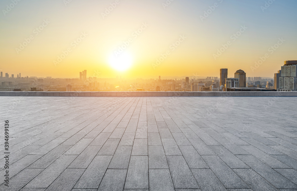 Empty floor and modern city skyline with building at sunset in Suzhou, Jiangsu Province, China. high angle view , ai