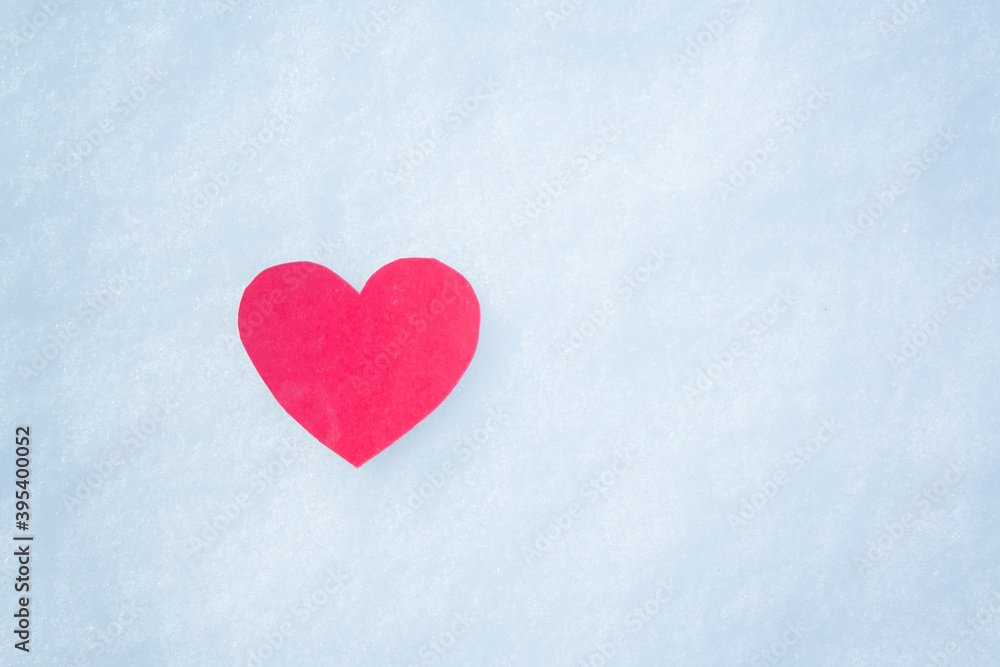 paper red heart on snow with snowflakes. Love winter. Valentine day, mother day, woman day. .