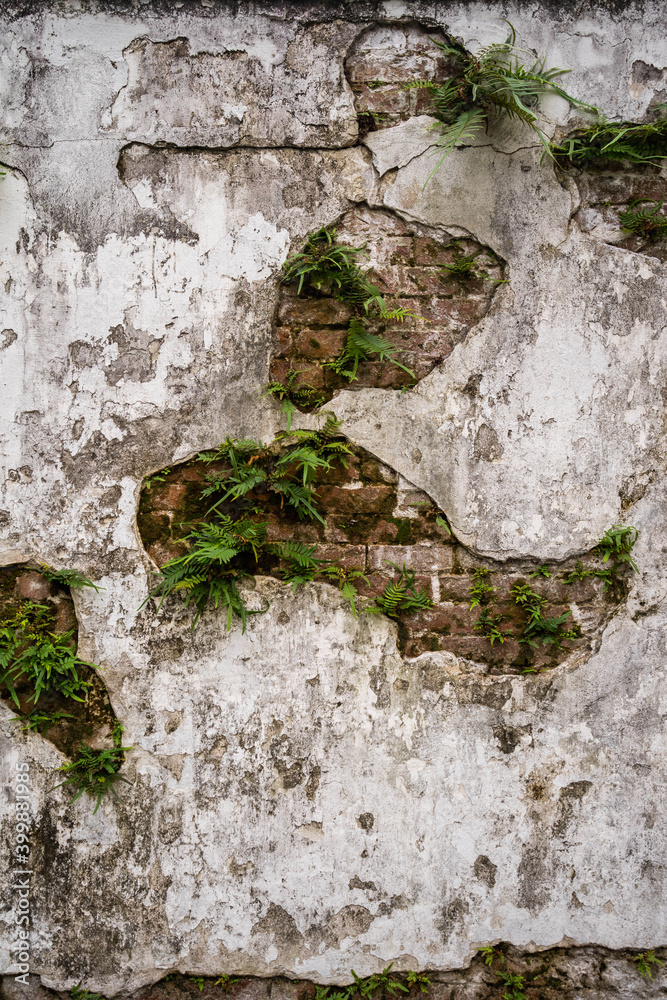 The old cobblestone wall is covered with plants, used as a background or texture