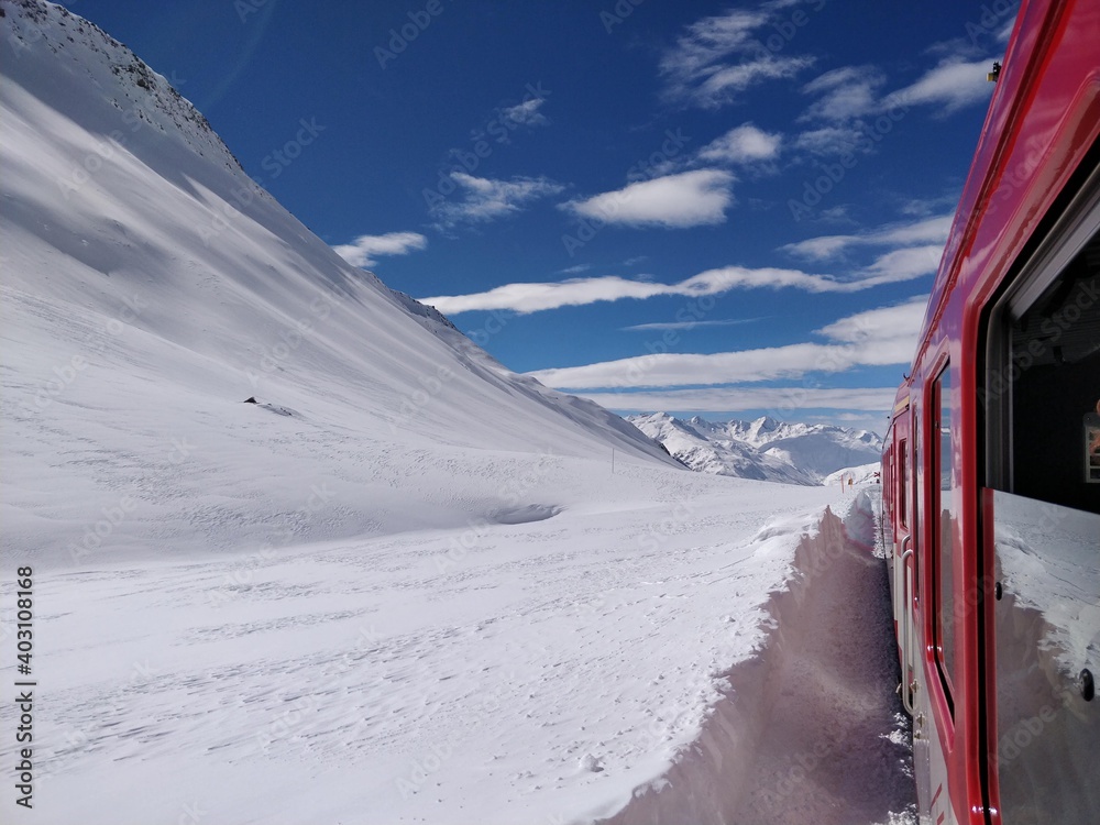Red delivery truck cautiously driving on a snow-laden mountain road under cloudy skies.