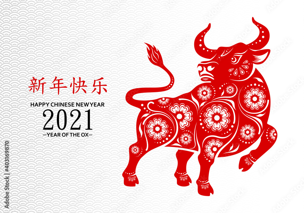 Happy Chinese new year 2021, zodiac sign year of ox with Chinese characters (Translation: Happy Chinese new year 2020, zodiac sign year of ox with Chinese characters (Translation: Ox)