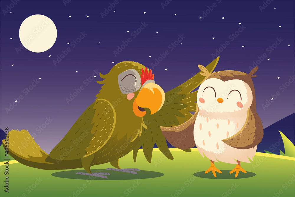 Cartoon Animals Parrot And Owl Night Nature Wallpaper Mural - Decorly Solutions | Decorly Solutions