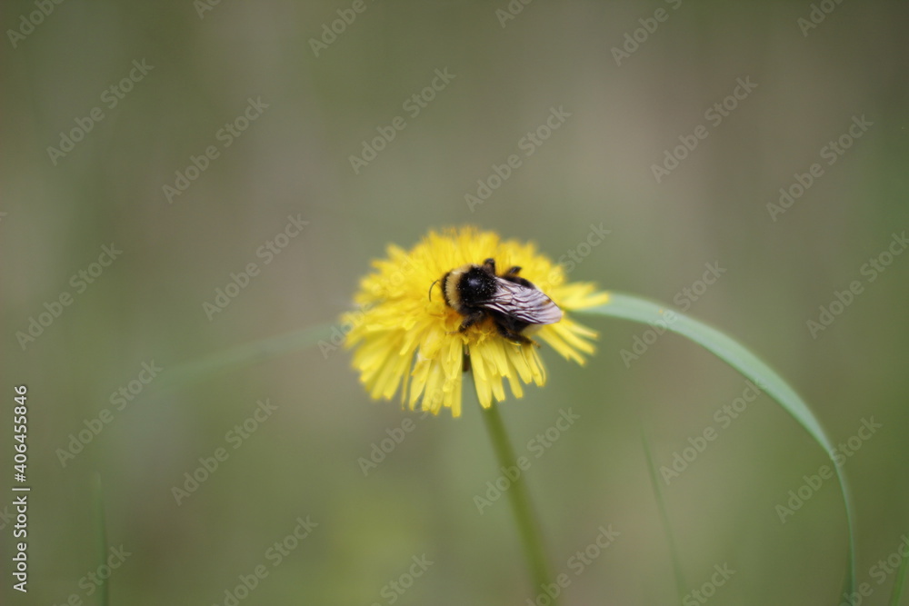 Bee full of pollen collecting nectar on a wild yellow dandelion flower, blurred green spring background