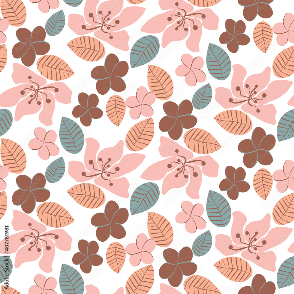 Soft pastel flowers and leaves, hand-drawn seamless pattern design