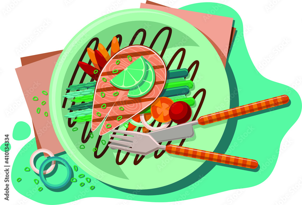 Plate With Grilled Salmon Served With Lime And Onion And Cutlery
