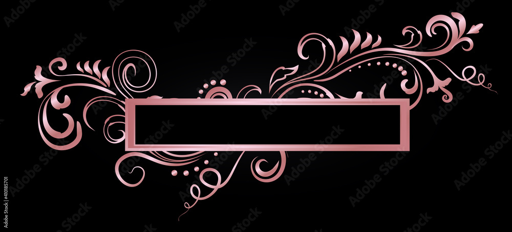 Rose golden shiny glowing ornate sqaure frame isolated over black