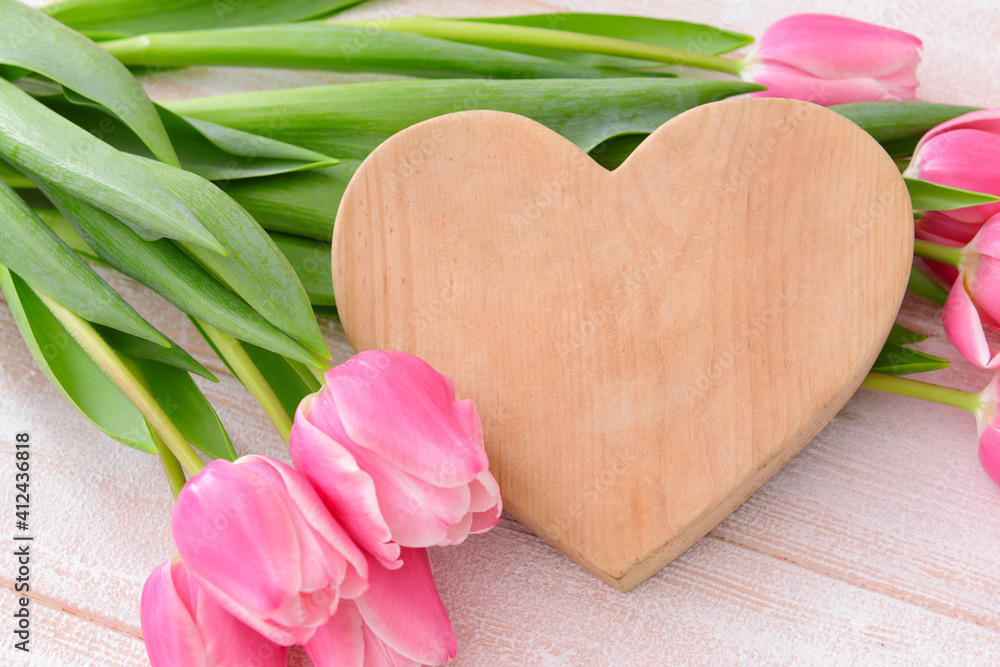 Beautiful Flowers And Wooden Heart On Light Background Wallpaper Mural - Decorly Solutions | Decorly Solutions