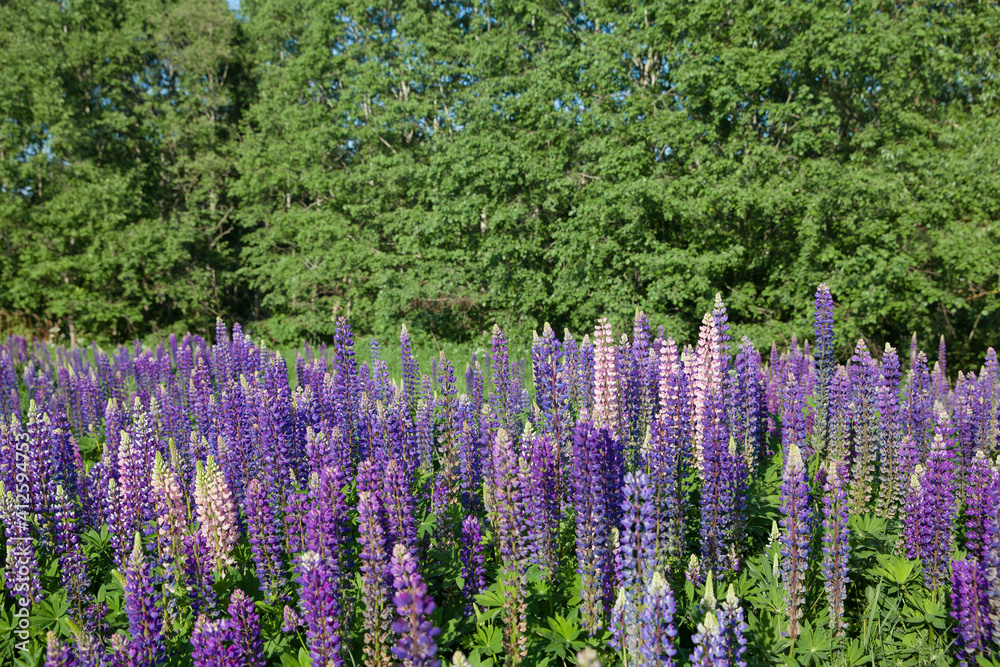 Blooming lupine flowers. A field of lupines. Violet and pink lupin in meadow. Colorful bunch of lupines summer flower background or greeting card.