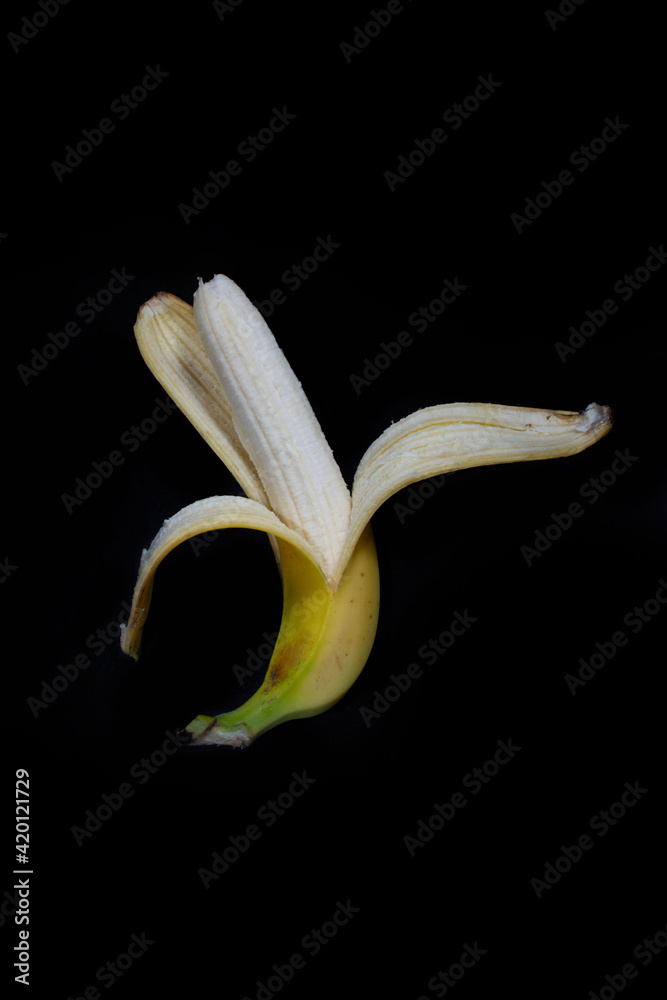 Partially Peeled Banana On A Black Background. The Peel Curls Dramatically.