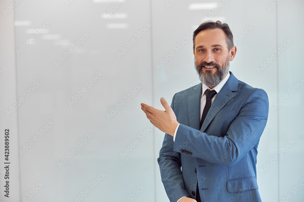 Happy adult caucasian man is working in a modern office