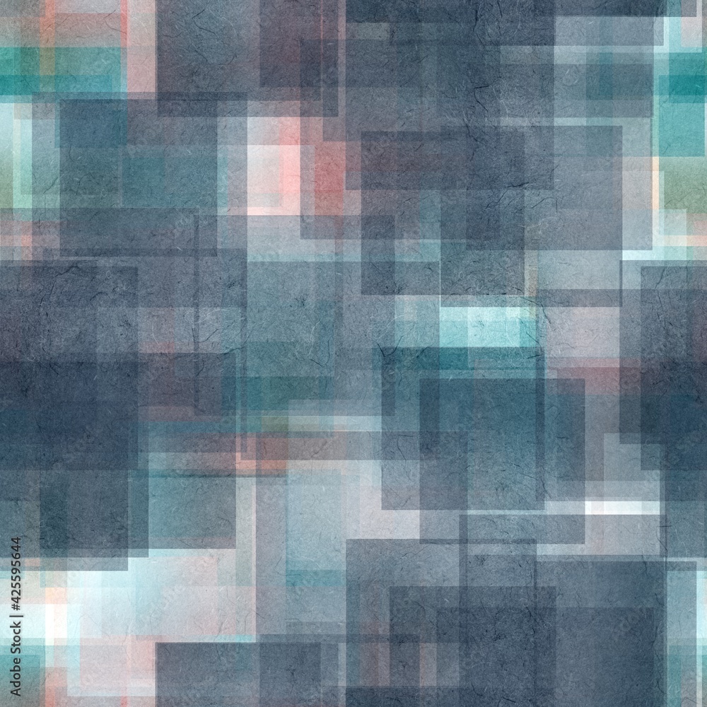 Seamless overlaid geometric shape pattern print. High quality illustration. Transparent rectangles filled with gradient colors scattered. Handmade paper texture overlay.