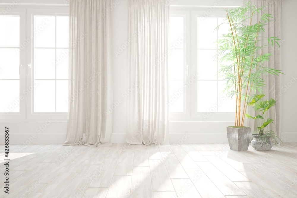 White empty room with summer landscape in window. Scandinavian interior design. 3D illustration
