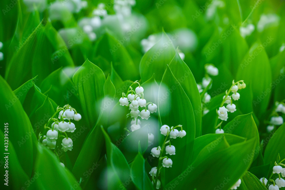 Delicate white lily of the valley flowers bloom amidst lush green leaves in springtime sunlight
