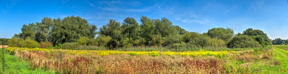 Panoramaansicht eines renaturierten Teilabschnitts des Fluss Nidda in einem Naherholungsgebiet in Frankfurt am Main bei schönem, sonnigem Wetter