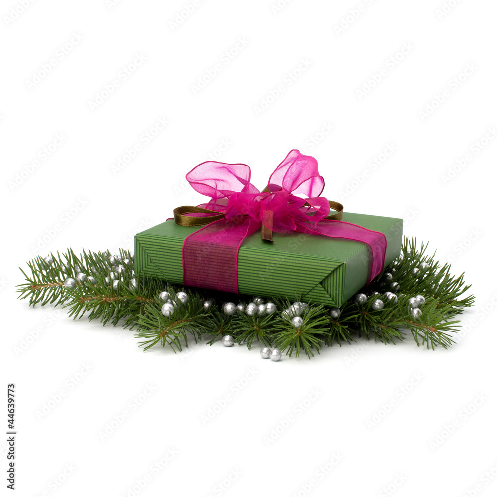 Green speckled christmas gift box tied with red tartan ribbon, surrounded by pine branches with a dusting of snow