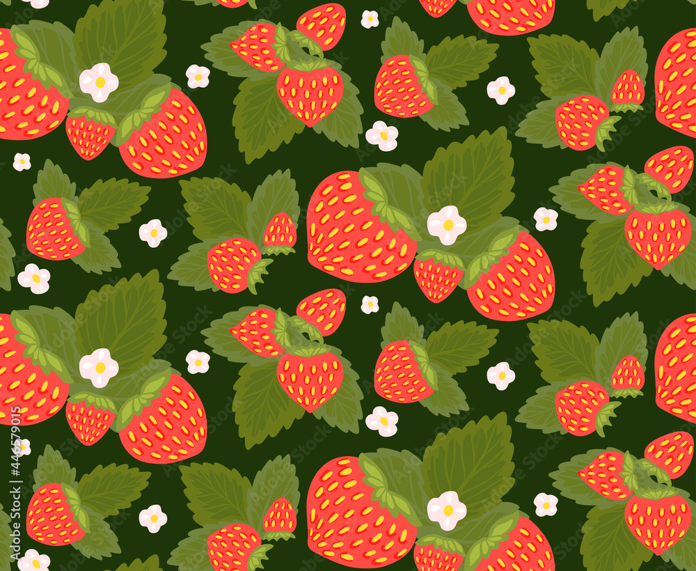 Seamless pattern with juicy strawberries foliage and small w Wallpaper