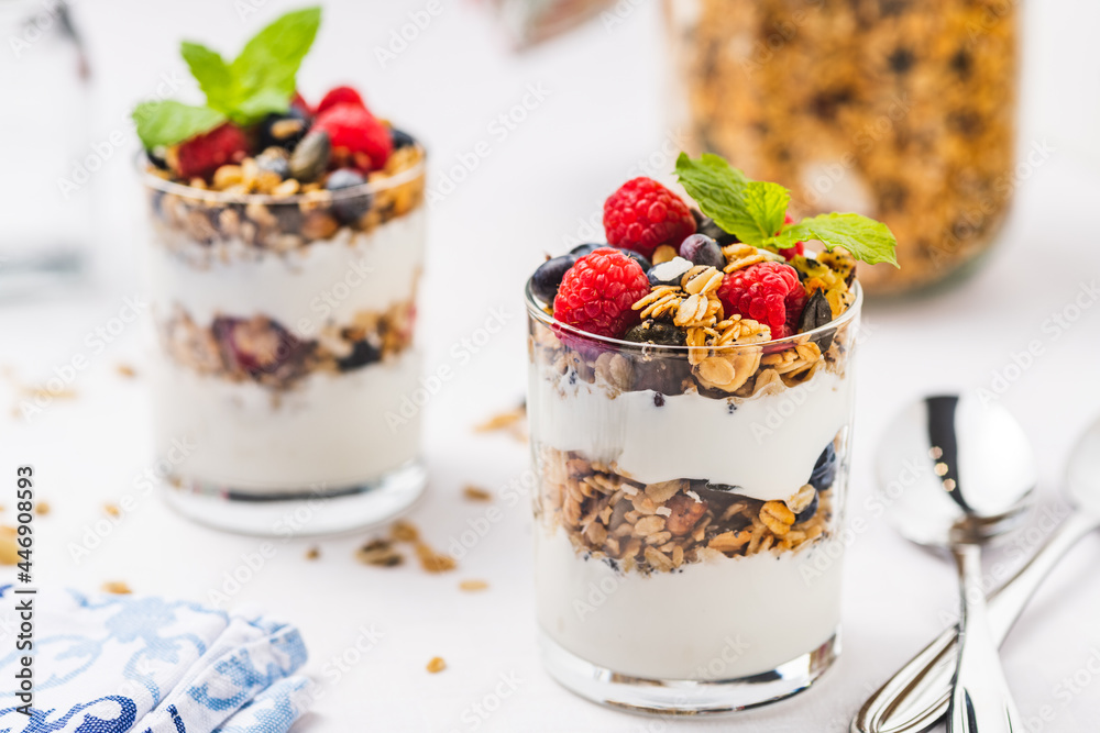 Fresh Fruit And Yogurt Parfaits, Including Layers Of Granola And Berries, Displayed On A Light Grey Background, Capturing The Freshness And Texture Of The Ingredients