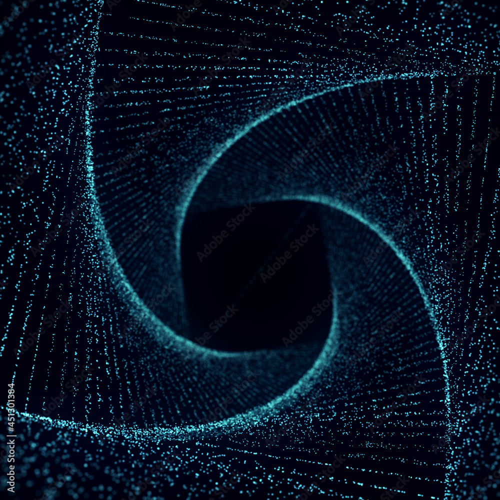 Abstract fractal lighting tunnel. 3d rendering. Swirling blue symbol. Optical illusion. Twisted wormhole. 3D wireframe abstract tunnel.