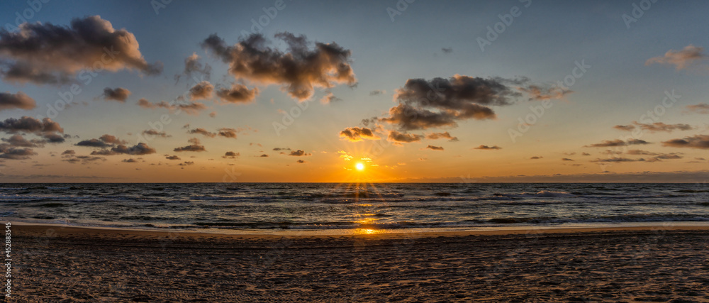 Panorama of a colorful beach sunset with the sun dropping in Wallpaper