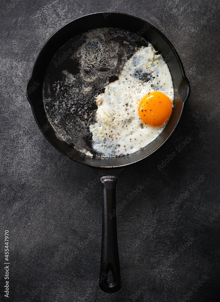 Close-up of a fried egg in a cast iron pan, text space for recipe ideas