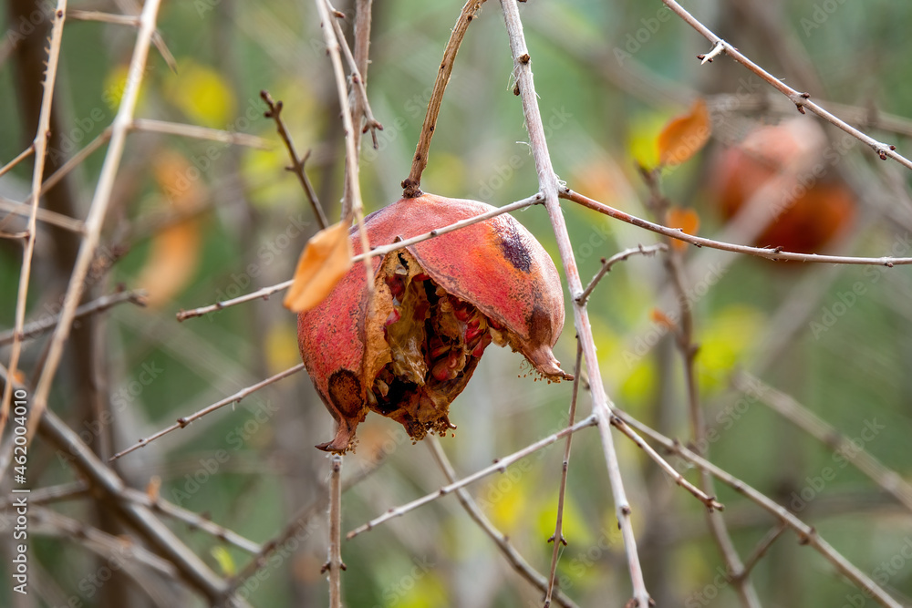 The pomegranate (Punica granatum) fruits were cracked on the tree over the winter, along the Aegean Sea coast, Greece.