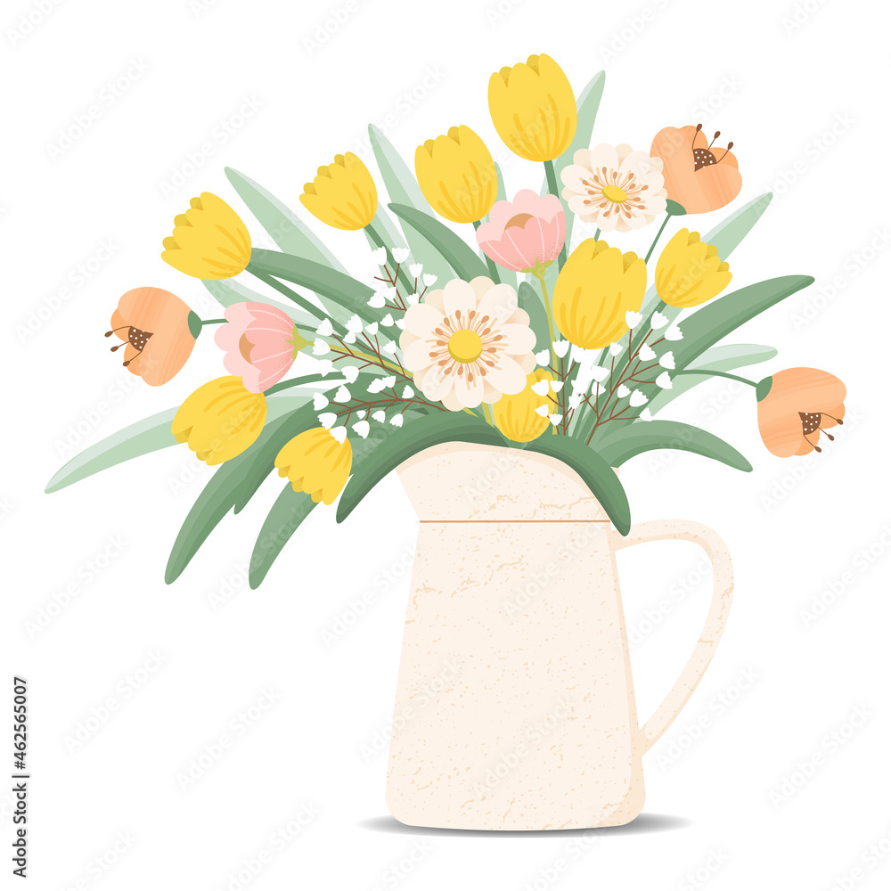 Bouquet Of Blooming Spring Flowers In Pitcher Vector Wallpaper Mural - Decorly Solutions | Decorly Solutions