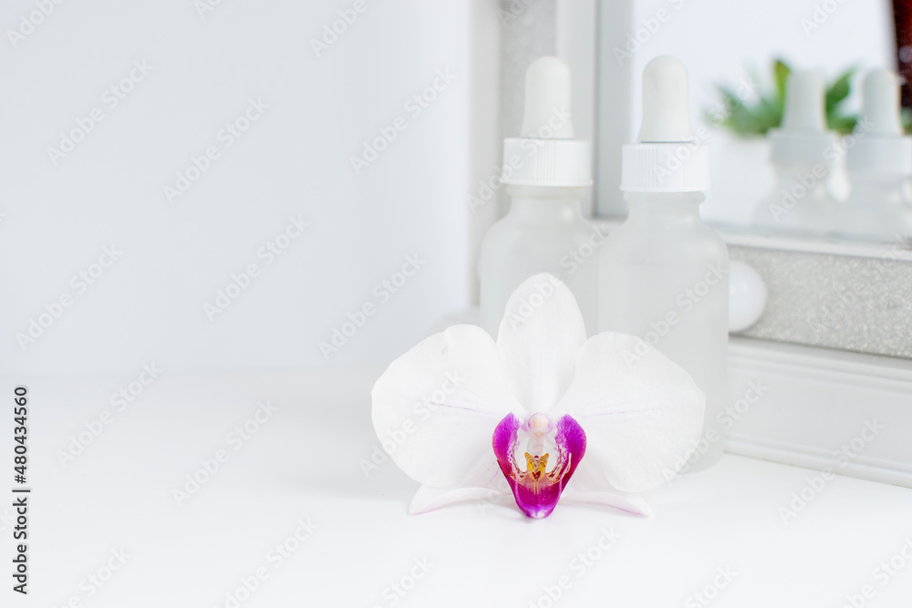 Two Bottles Of Skincare Serums In A White Wallpaper Mural - Decorly Solutions | Decorly Solutions