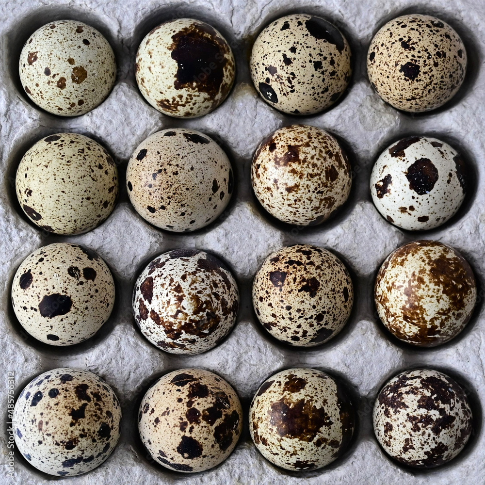 Quail eggs in the package, top view.