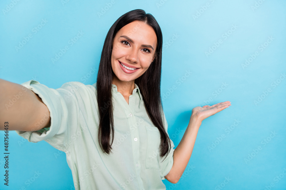Portrait of girlish girl with straight hair dressed print blouse posing in frame indicating empty space isolated on blue color background