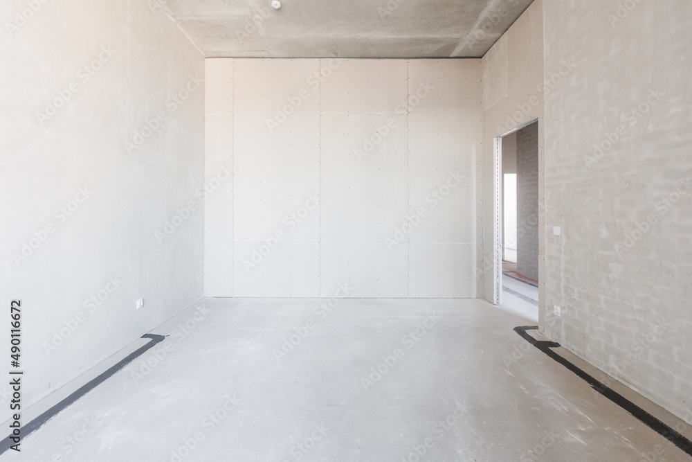 New empty room under construction. Plaster walls. New home. Concrete walls. Interior renovation.
