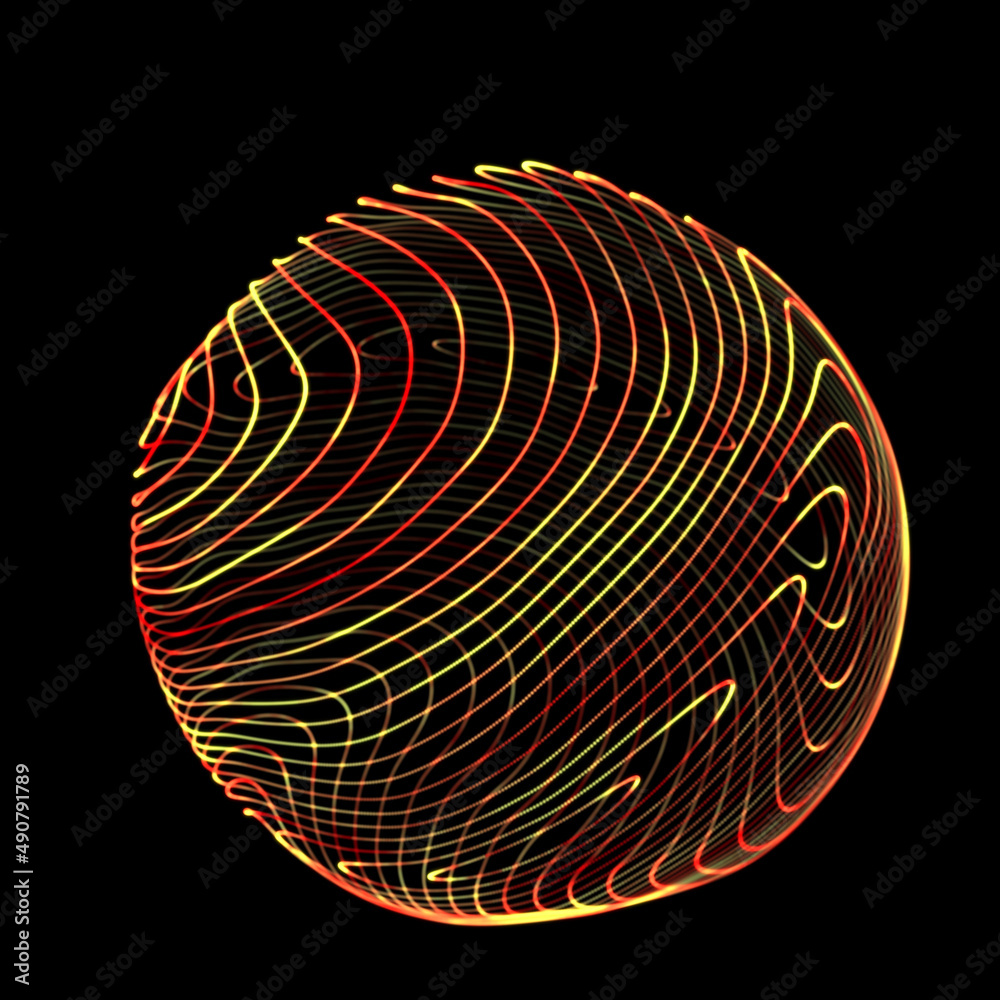 Wireframe red sphere with twisted lines. Futuristic technology circle with twisted glowing lines. Abstract 3d logo. Illustration of curled stripes shape.