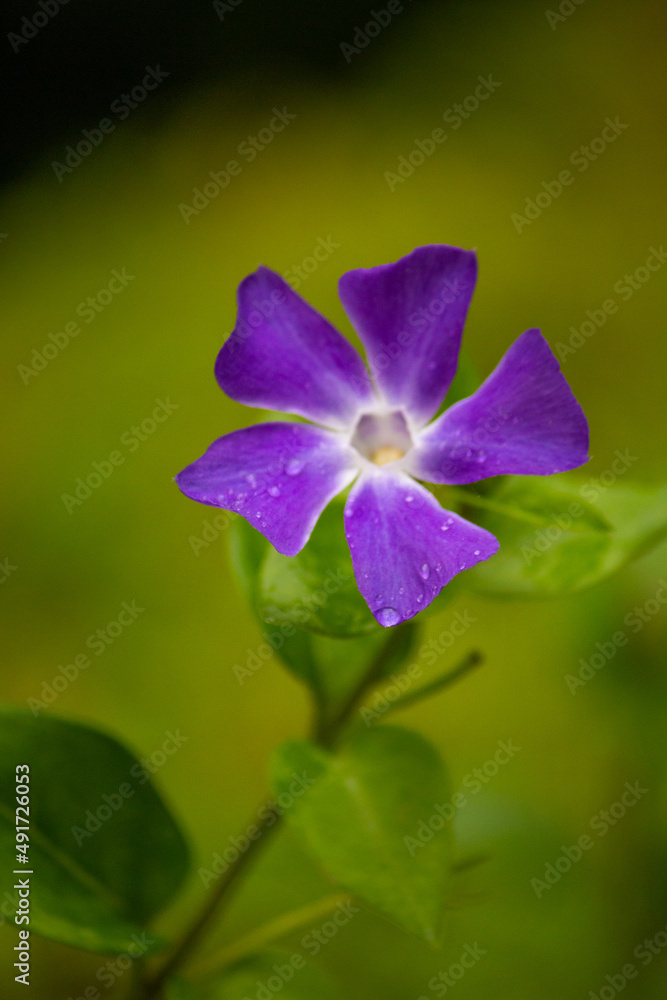 green periwinkle leaf texture as background, blue periwinkle flowers on green background
