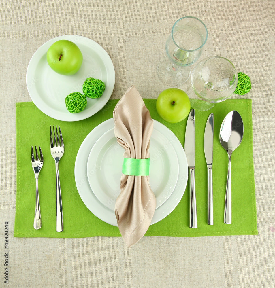 Silhouette top view table setting with dinner plate knives forks spoons vector flat illustration isolated on white background