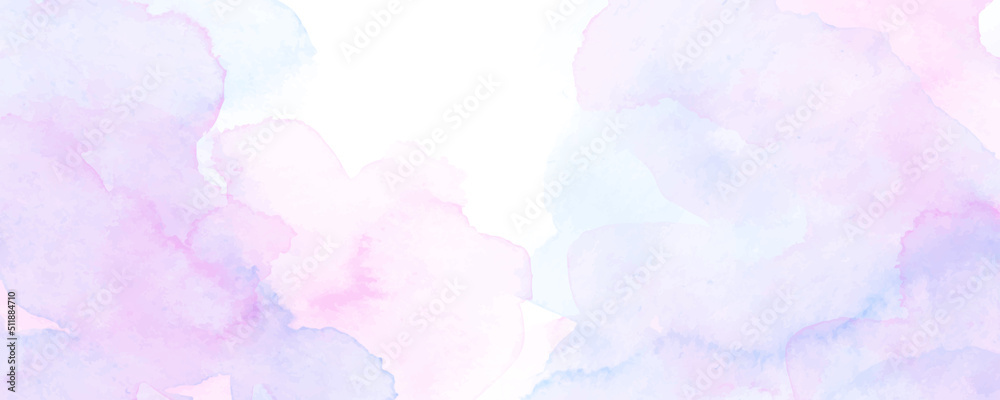 Pink pastel watercolor background with white clouds. Abstract pink sky banner template. White clouds in the pink sky. Happy Valentine's Day