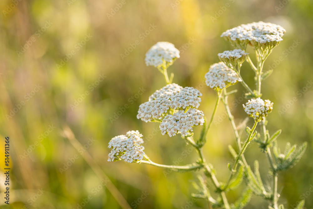 Common yarrow (Achillea) white flowers close up. Medicinal organic natural herbs, plants concept. Wild yarrow, wildflower.