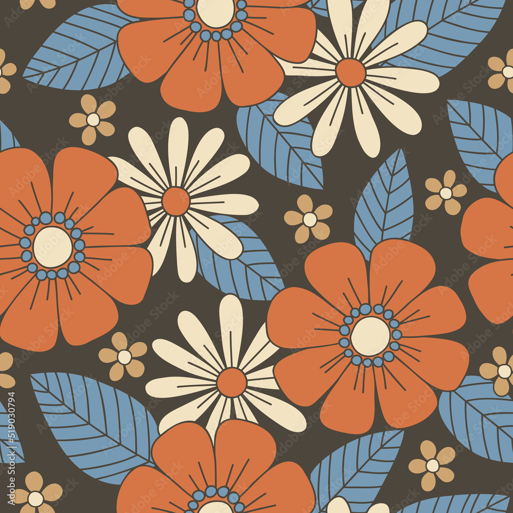 vector flat logo illustration, trendy floral seamless illustration. Vintage floral background in 70s style.