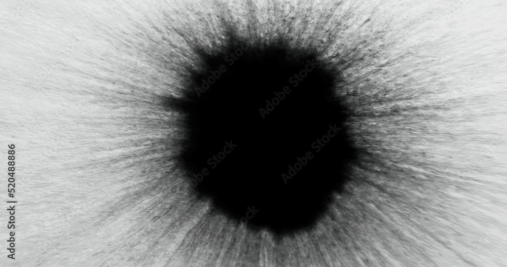 Paint blot transition. Grunge fluid explosion. Black pigment spill on white wet background. Defocused round contrast splotch abstract reveal.