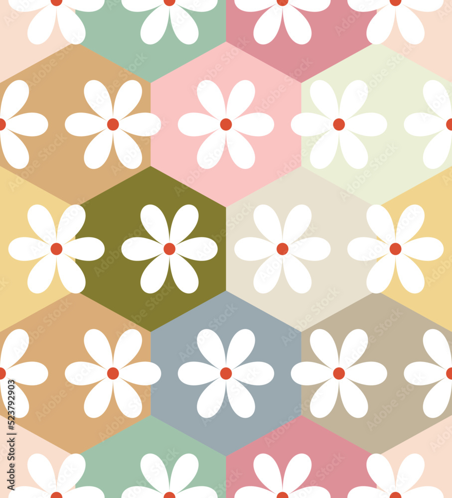 Abstract Geometric Hexagons Retro Daisy Flowers Pastel Colors Wallpaper Mural - Decorly Solutions | Decorly Solutions