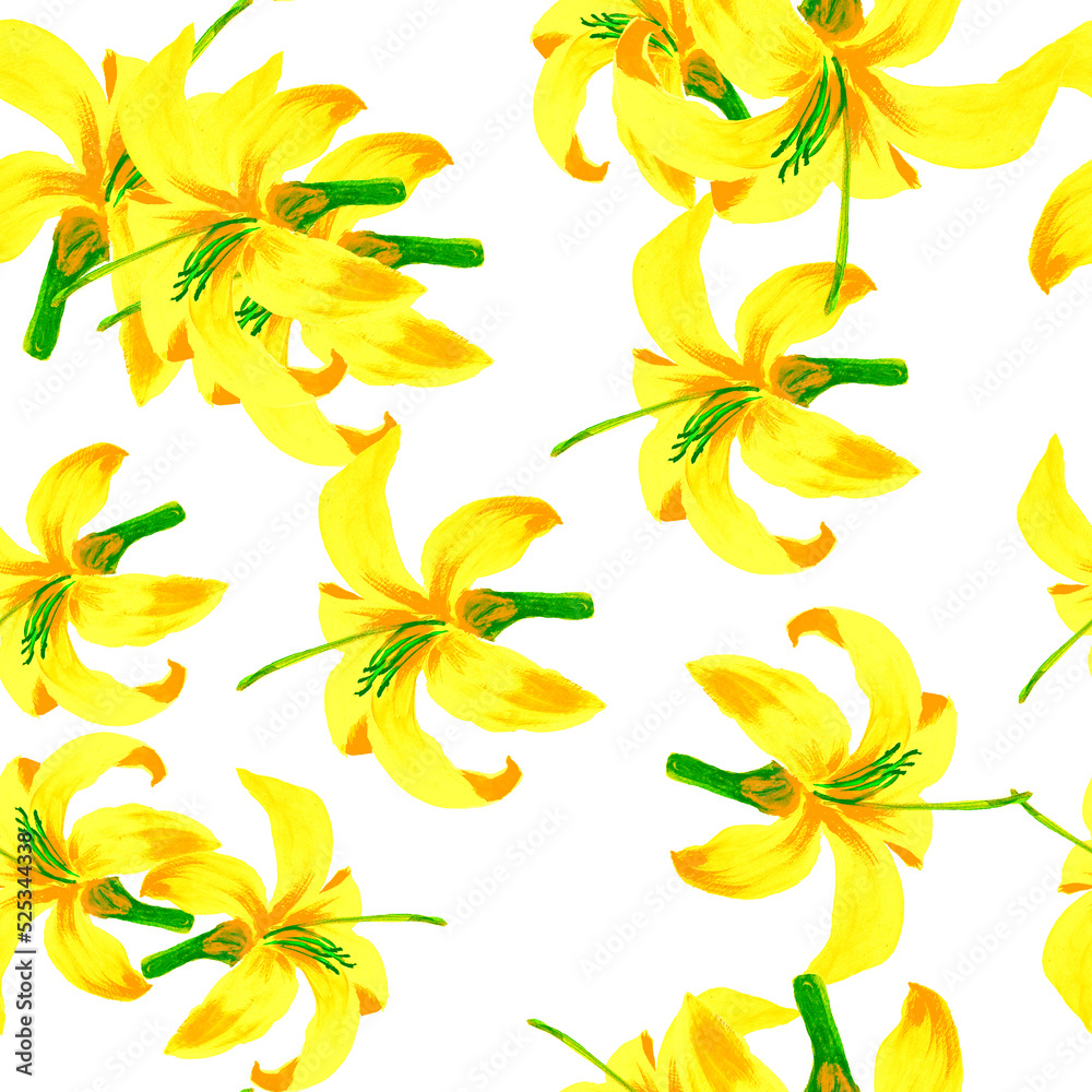 Yellow Seamless Design. Beige Pattern Leaves. Golden Tropical Design. White Flower Leaf. Floral Painting. Wallpaper Botanical. Flora Texture. Spring Leaves.