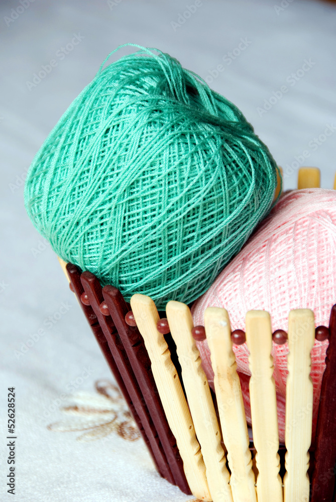 knitted cotton basket, yarn tangles and thick needles