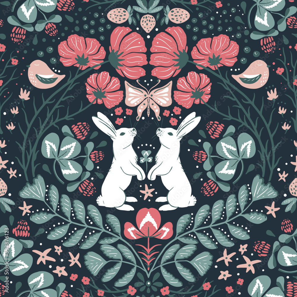 Seamless pattern with blooming cosmea branches, rabbits, berries and birds. Wildlife silhouette, dark floral background. Vector hand drawn illustration, garden in folk - scandinavian style.
