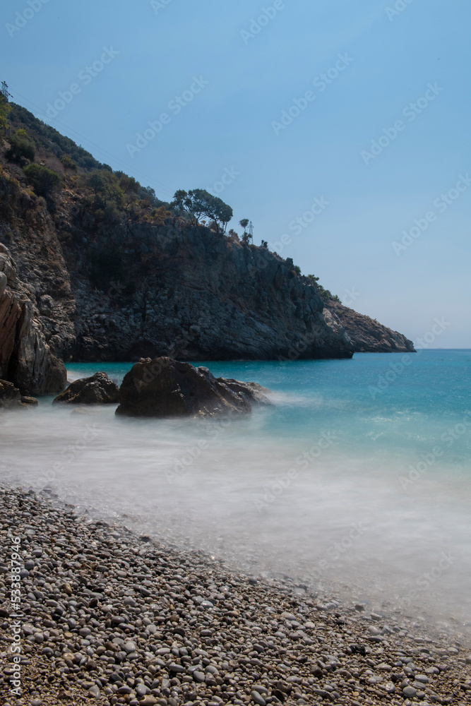Long exposure by the sea Waves break against stones Sunset a Wallpaper