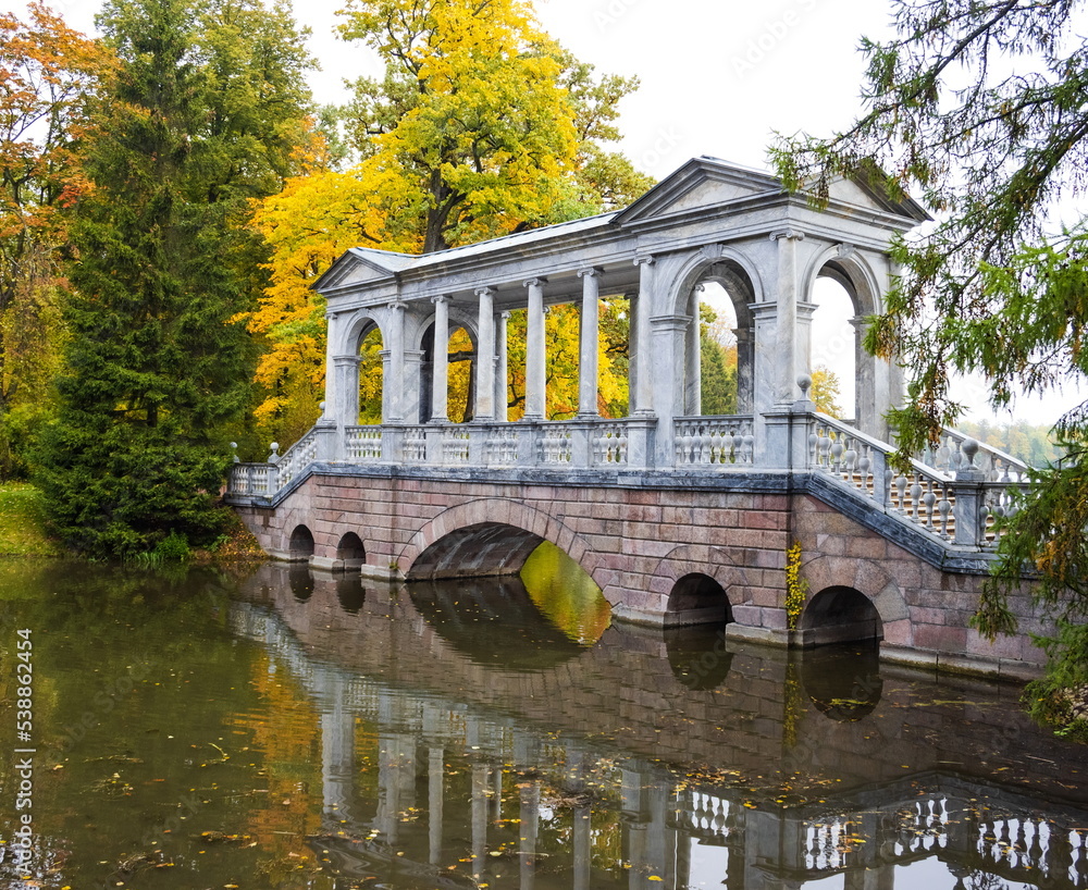 Marble bridge in the golden autumn. Walking through Tsarskoe Selo