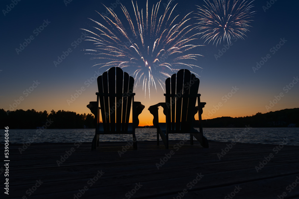 Canada Day Fireworks Over Two Adirondack Chairs On Wallpaper Mural - Decorly Solutions | Decorly Solutions
