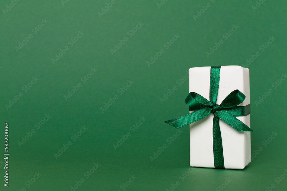 Gift box with green ribbon bow on color background Wallpaper