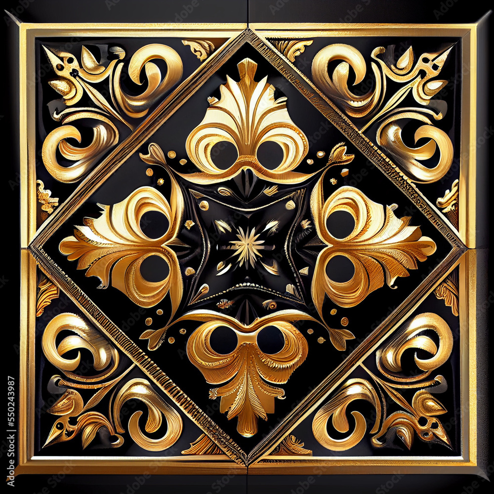 Intricate gold damask pattern on dark wood